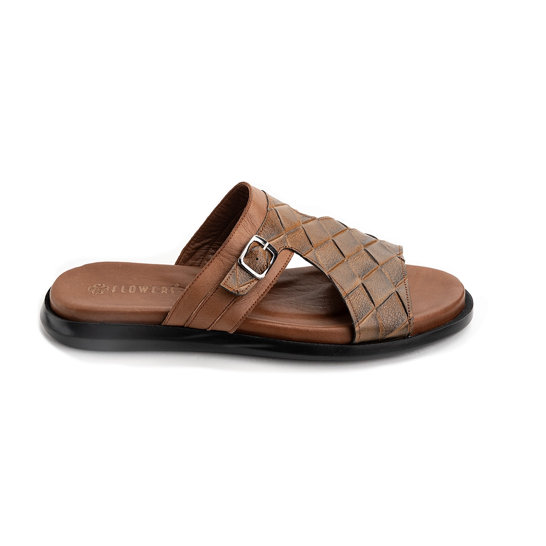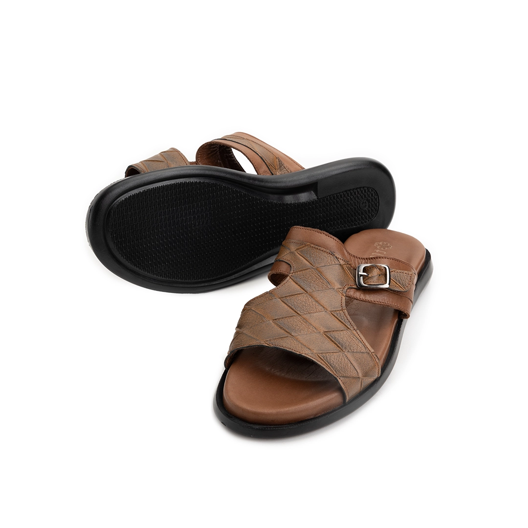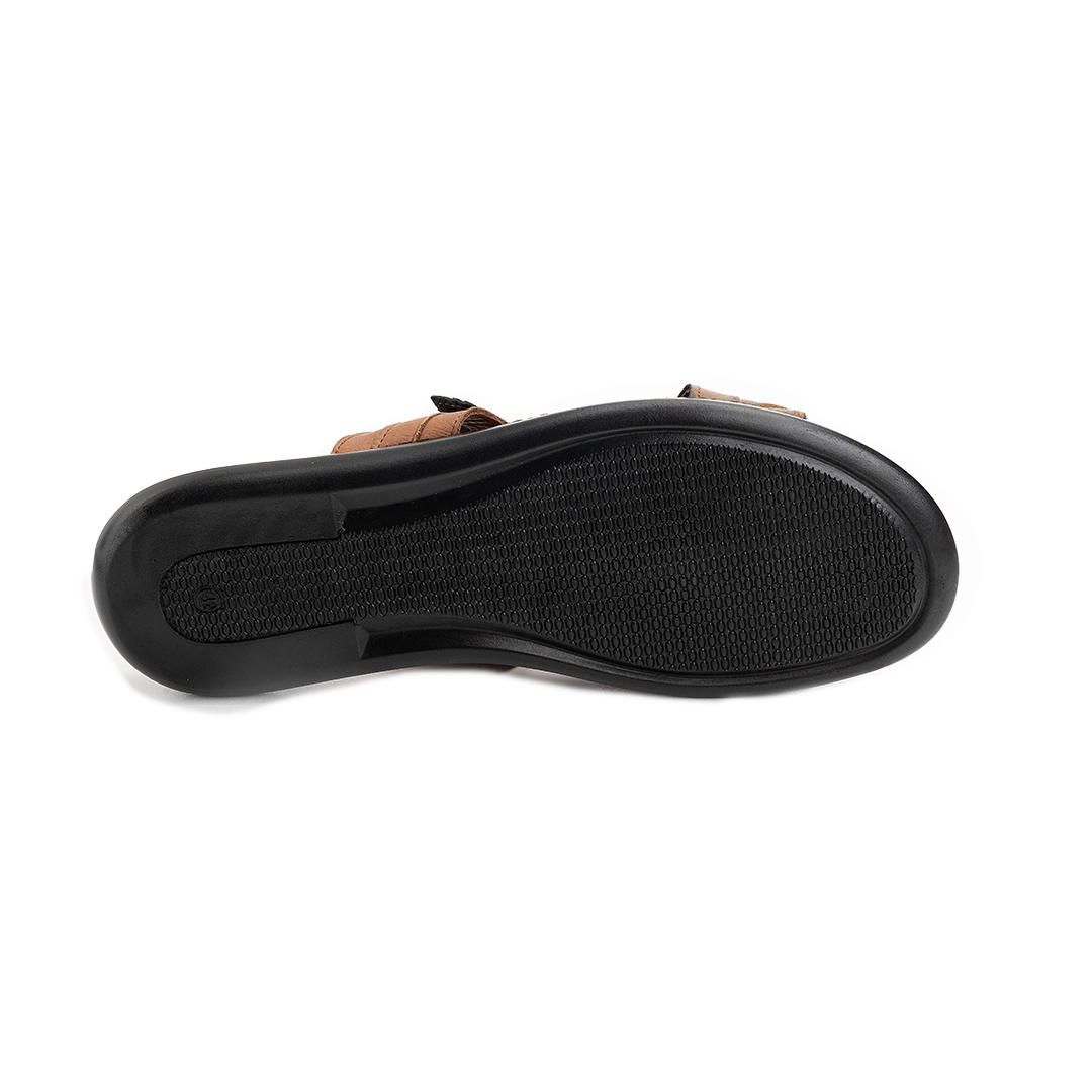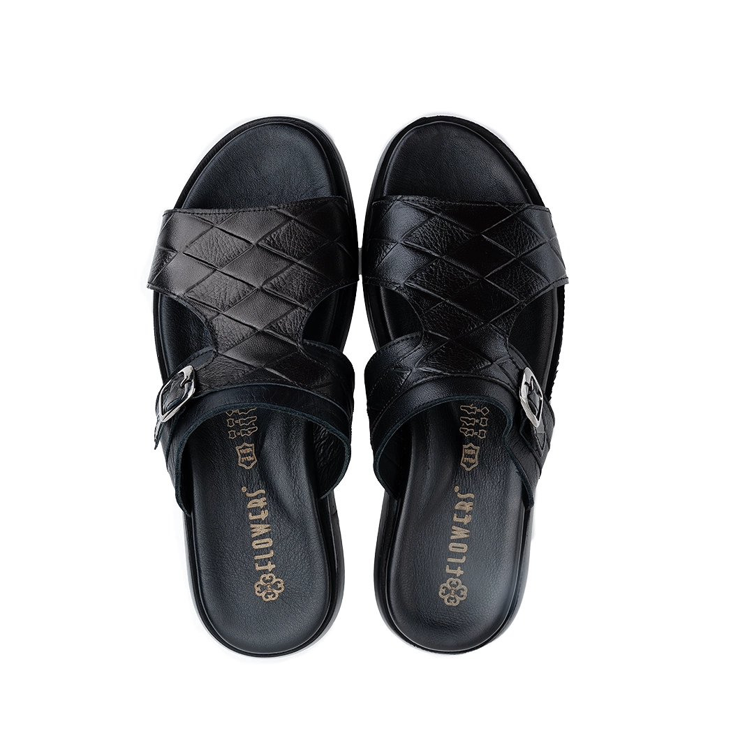 ترکیب چرم طرحدار با رنگ‌بندی متنوع جلوه‌ای خاص و همه‌پسند به دمپایی بخشیده است.