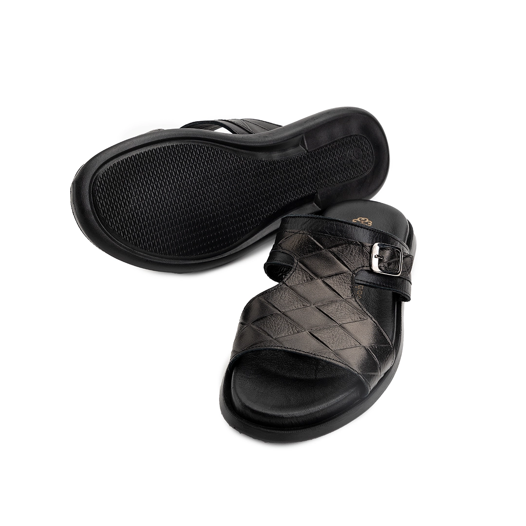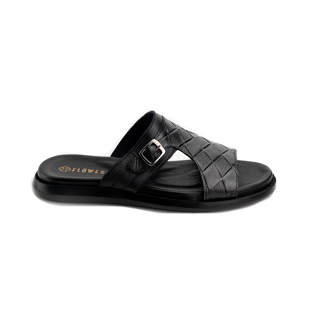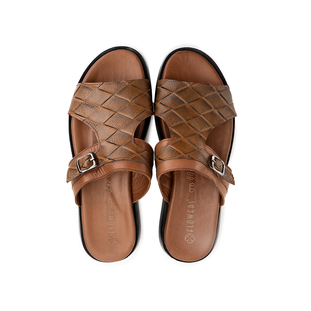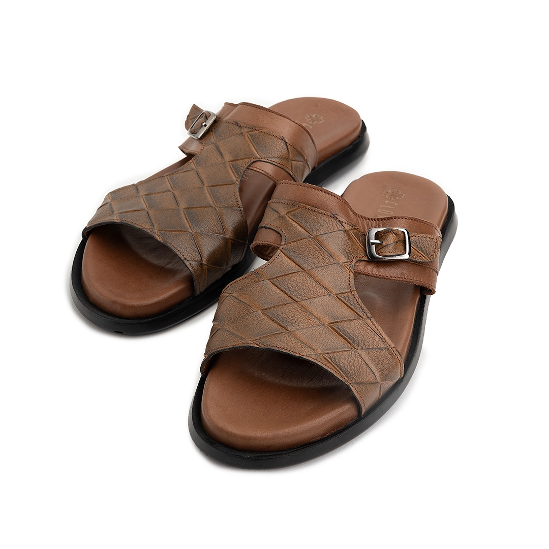 ترکیب چرم طرحدار با رنگ‌بندی متنوع جلوه‌ای خاص و همه‌پسند به دمپایی بخشیده است.