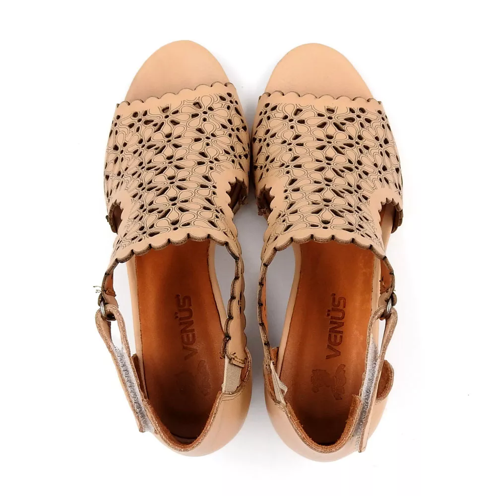 رویه کفش از چرم طبیعی گاوی ممتاز ساخته شده است که نرمی و انعطافپذیری بالایی دارد. این چرم علاوه بر دوام طولانی، خاصیت تنفسپذیری طبیعی دارد و اجازه میدهد پا در طول روز خشک و خنک بماند. برشهای منظم و هنرمندانه روی رویه، که به شکل طرحهای گلمانند و هندسی کار شدهاند، جلوهای زنانه، لطیف و در عین حال مجلل به کفش میدهند. این برشها علاوه بر زیبایی، باعث جریان بهتر هوا در داخل کفش میشوند و آن را برای روزهای گرم سال به گزینهای ایدهآل تبدیل میکنند.