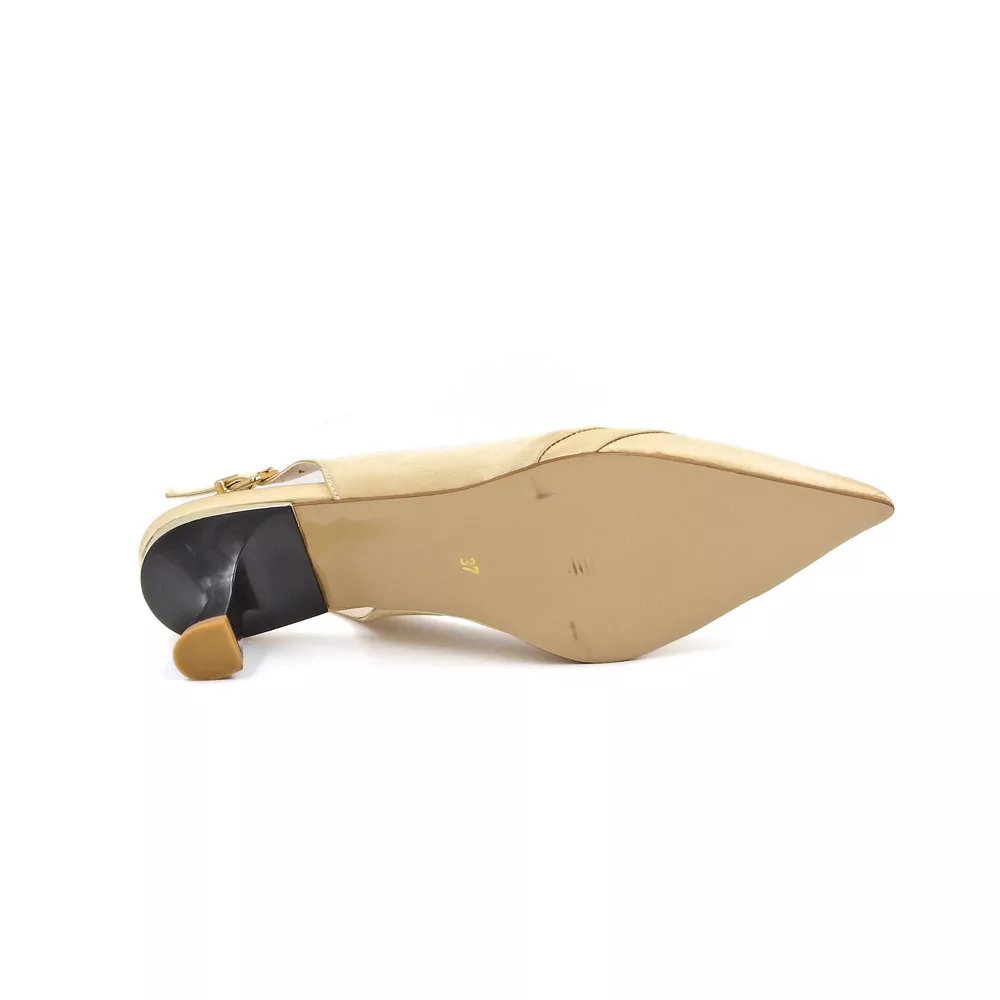 در بخش پشتی کفش زنانه مجلسی کد 1215، بند باریکی با سگک طلایی قابل تنظیم طراحی شده است که علاوه بر زیبایی، امکان تنظیم اندازهی دلخواه را فراهم میکند و به فیت شدن کامل کفش روی پا کمک مینماید. فرم باز پشت کفش (Slingback) نیز باعث تهویه بهتر پا و افزایش حس سبکی میشود، بهویژه در فصول گرمتر سال.